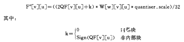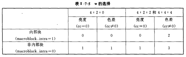 W为量化矩阵(加强矩阵),quantiser_scale为量化器比例因子。下面解释其中各个变量的选取方法。