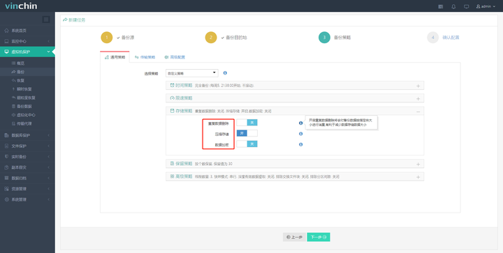开启“重复数据删除”将会对备份数据按数据块大小进行消重,有利于减少数据存储的大小,若有大量重复数据时建议开启此项。
