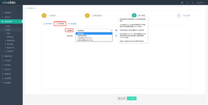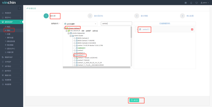 2、选择【虚拟机保护】——【备份】,新建备份任务。选择虚拟化类型【VMware vSphere】,再选择需要备份的虚拟机,点击【下一步】