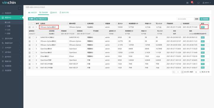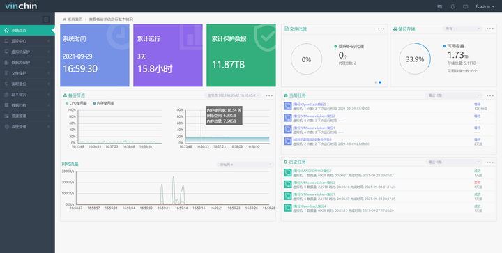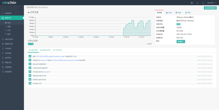10、在【任务详情】页面左上方显示任务运行时数据传输的流量速度,右上方显示任务的配置信息,下面显示备份任务的运行日志、虚拟机列表和历史任务。