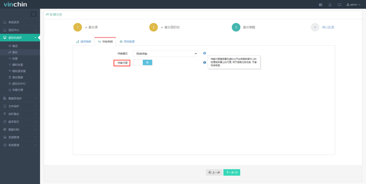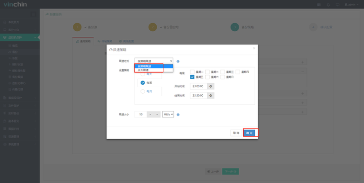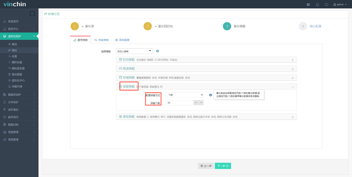 5、对备份任务进行其他配置,选择【限速策略】、【存储策略】、【保留策略】、【高级策略】