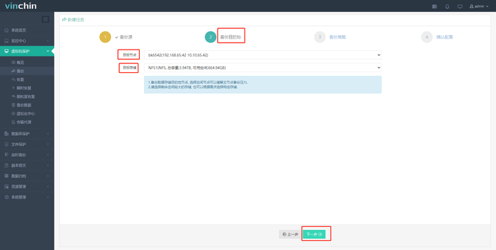 3、设置备份目的地,选择【目标节点】与【目标存储】,点击【下一步】