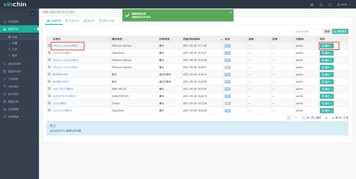 9、提交任务后自动跳转到【当前任务】页面,可以查看刚才创建的备份任务。点击右侧的“操作”按钮可以手动运行或停止任务,也可以等待系统按照设定的策略自动执行备份任务。点击任务名称,可以进入【任务详情】页面。