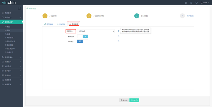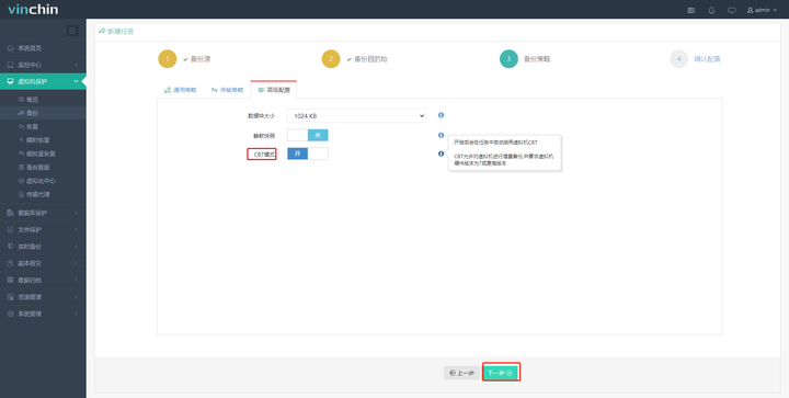 CBT模式:开启后会在任务中自动启用虚拟机CBT;CBT允许对虚拟机进行增量备份,并要求虚拟机硬件版本为7或更高版本