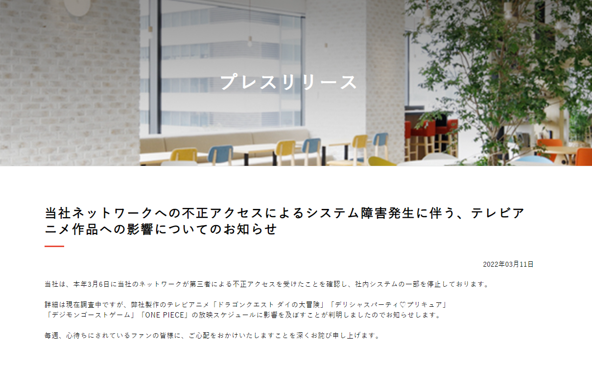 3月11日,日本东映动画公司发布公告称,公司网络系统遭受不明黑客袭击,导致系统瘫痪,公司多部在播动画的制作进度遭影响,同时片源存在外露风险。
