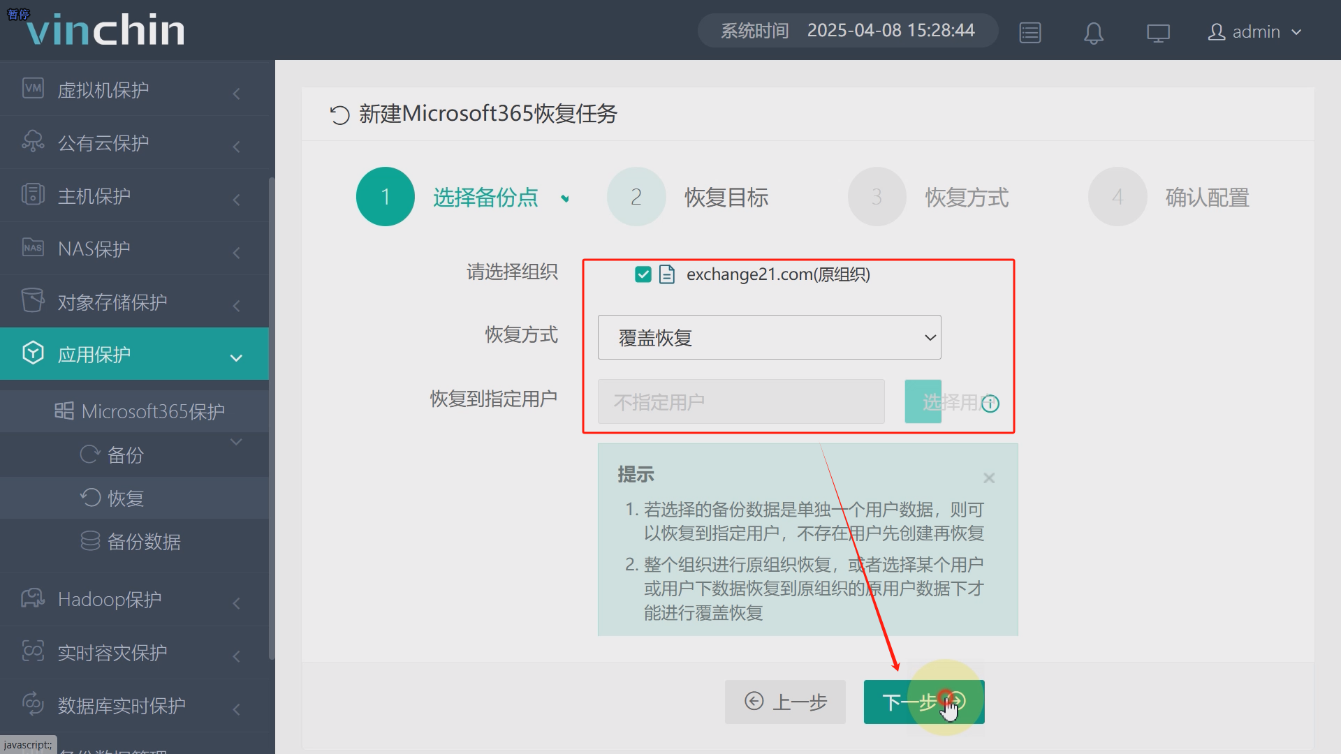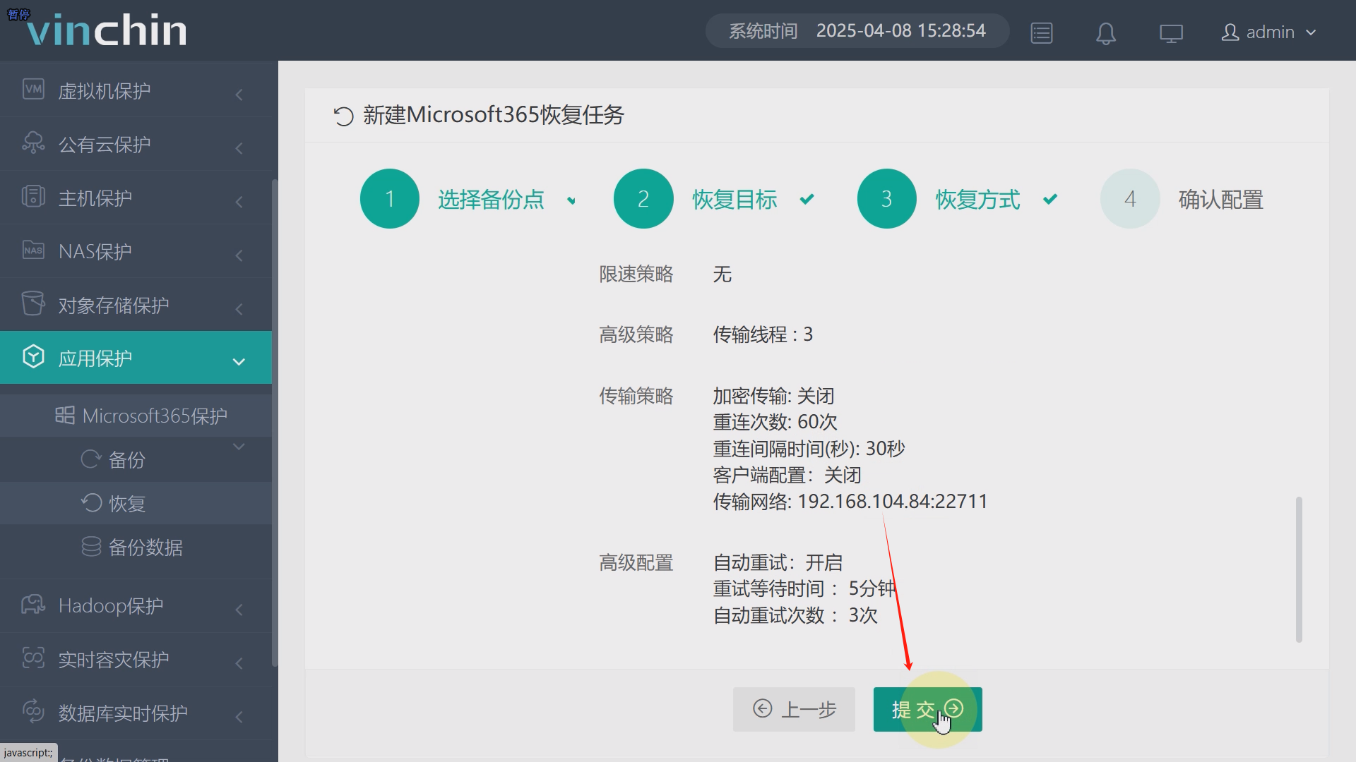 点击公有应用保护、Microsofit365保护、恢复,选择需要恢复的数据,并输入Exchange Server管理员账号密码,点击下一步,勾选目标组织,选择覆盖恢复,点击下一步,通用策略、传输策略、高级配置以系统默认为例,点击下一步,再次确认任务名称以及配置信息,准确无误后点击提交,恢复任务将立即执行,点击任务名,可查看任务详情,任务执行完成。如图17至图23。