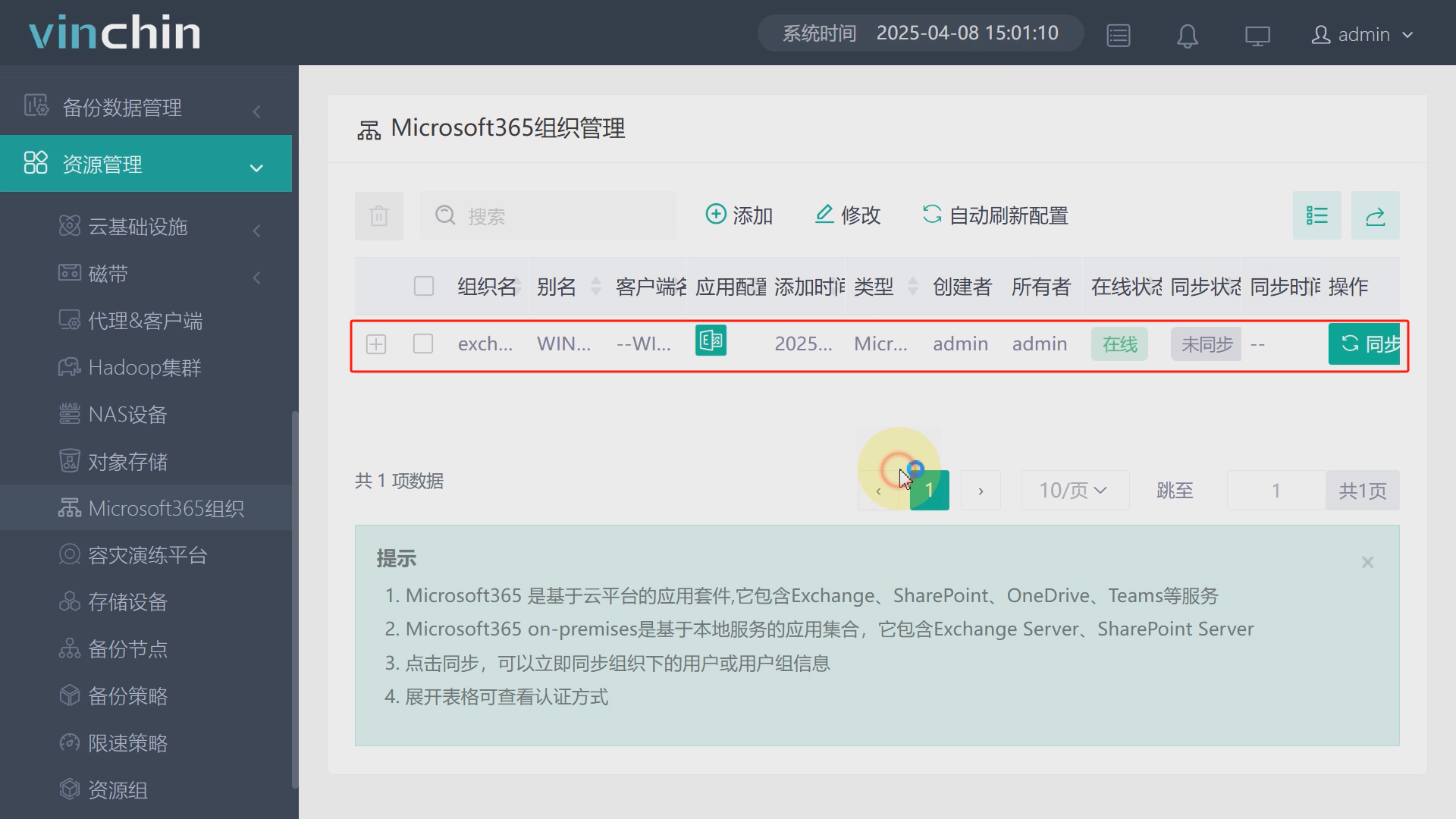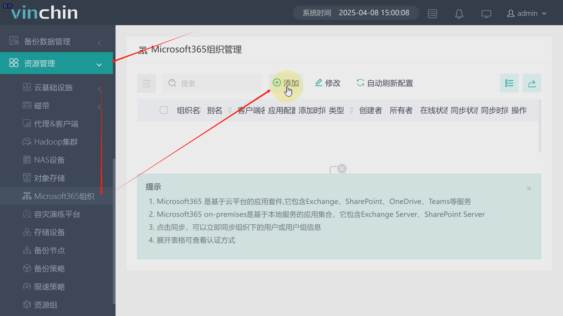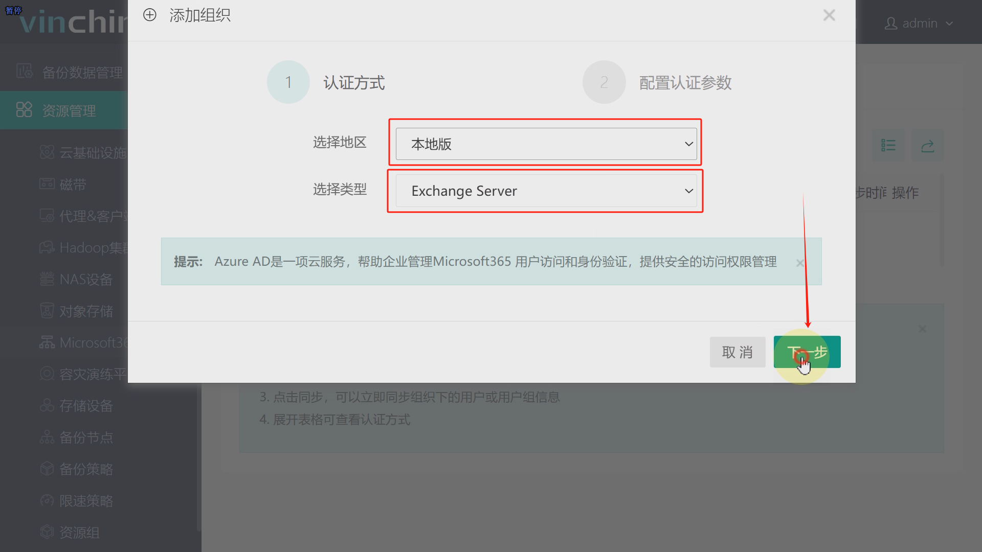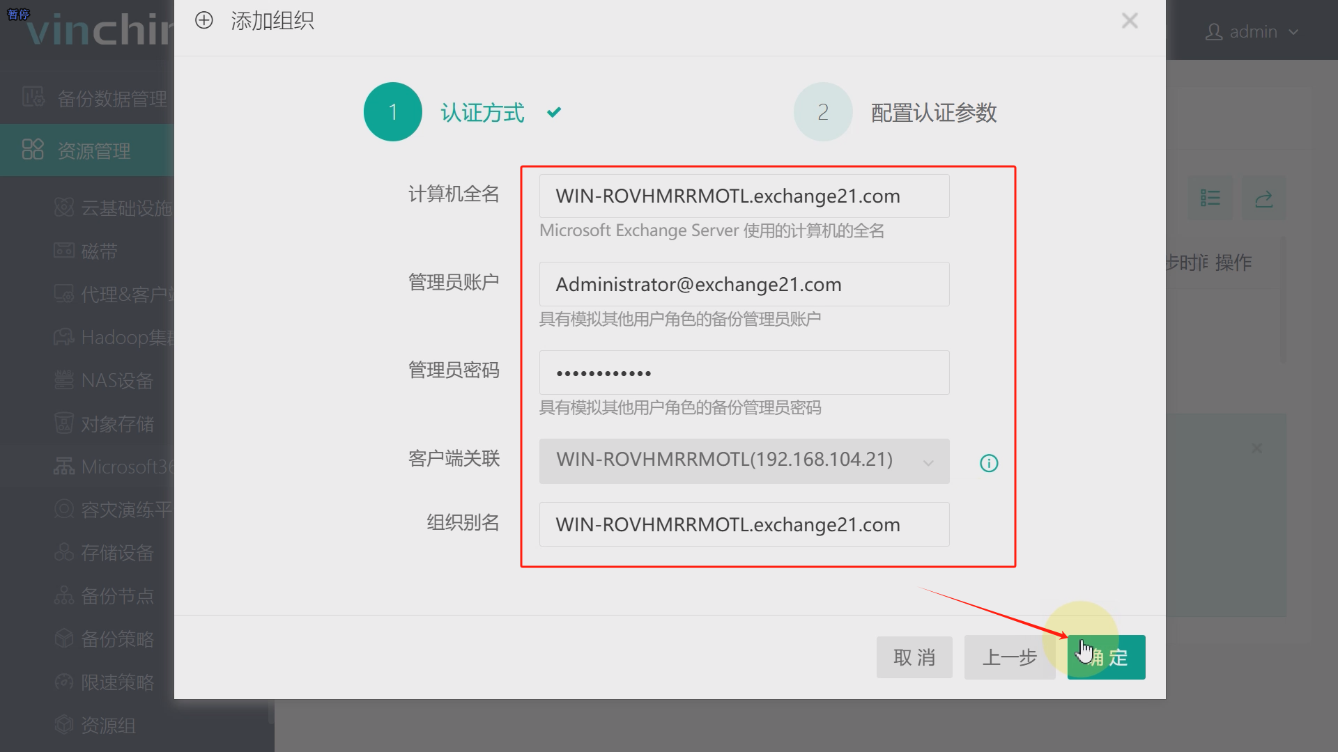 访问并登录云祺容灾备份系统,依次点击资源管理、Microsoft365、添加,地区选择本地版,点击下一步,依次填写计算机全名、管理员账户、管理员密码、客户端关联选择第一步中安装代理的主机,可多选,点击确定,如图8至图11。