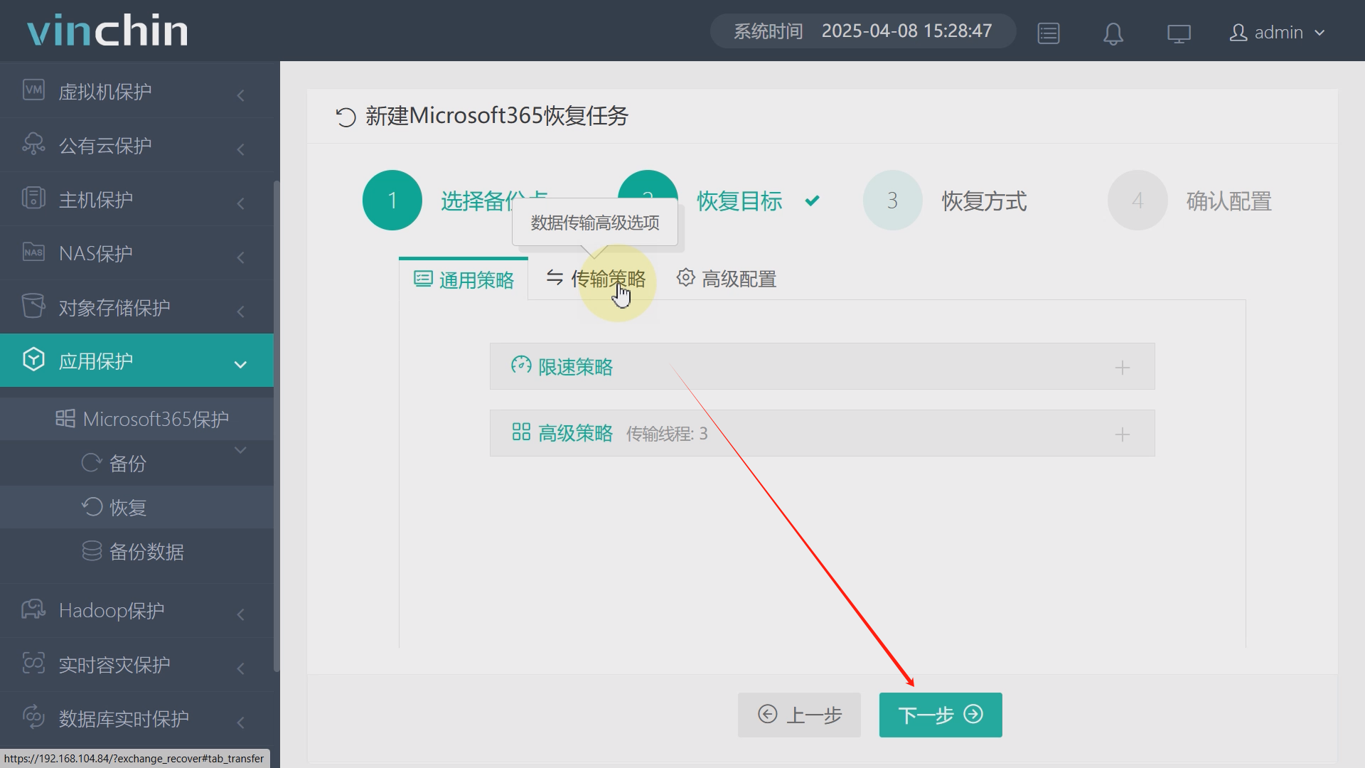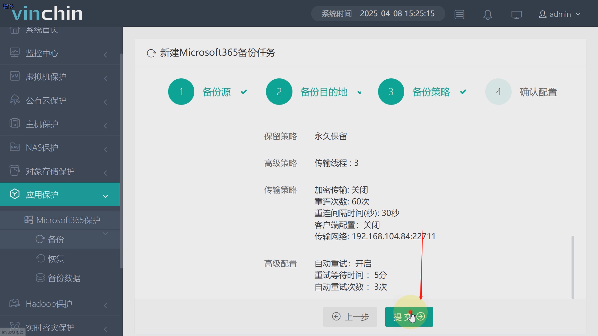 点击公有应用保护、Microsofit365保护、备份,展开Exchange Server组织并勾选需要备份的的用户数据,支持多选或选择整个组织,本文档以勾选其中一个用户为例,点击下一步。计算节点与目标存储本次演示以系统默认为例,点击下一步。时间策略则以永久增量备份为例,执行时间以及其他参数以系统默认为例,再切换至传输策略,点击下一步,核对任务信息,准确无误后点击提交,备份任务就创建完成了,后续该任务会自动定期备份所选用户的邮件数据。如图12至图16。