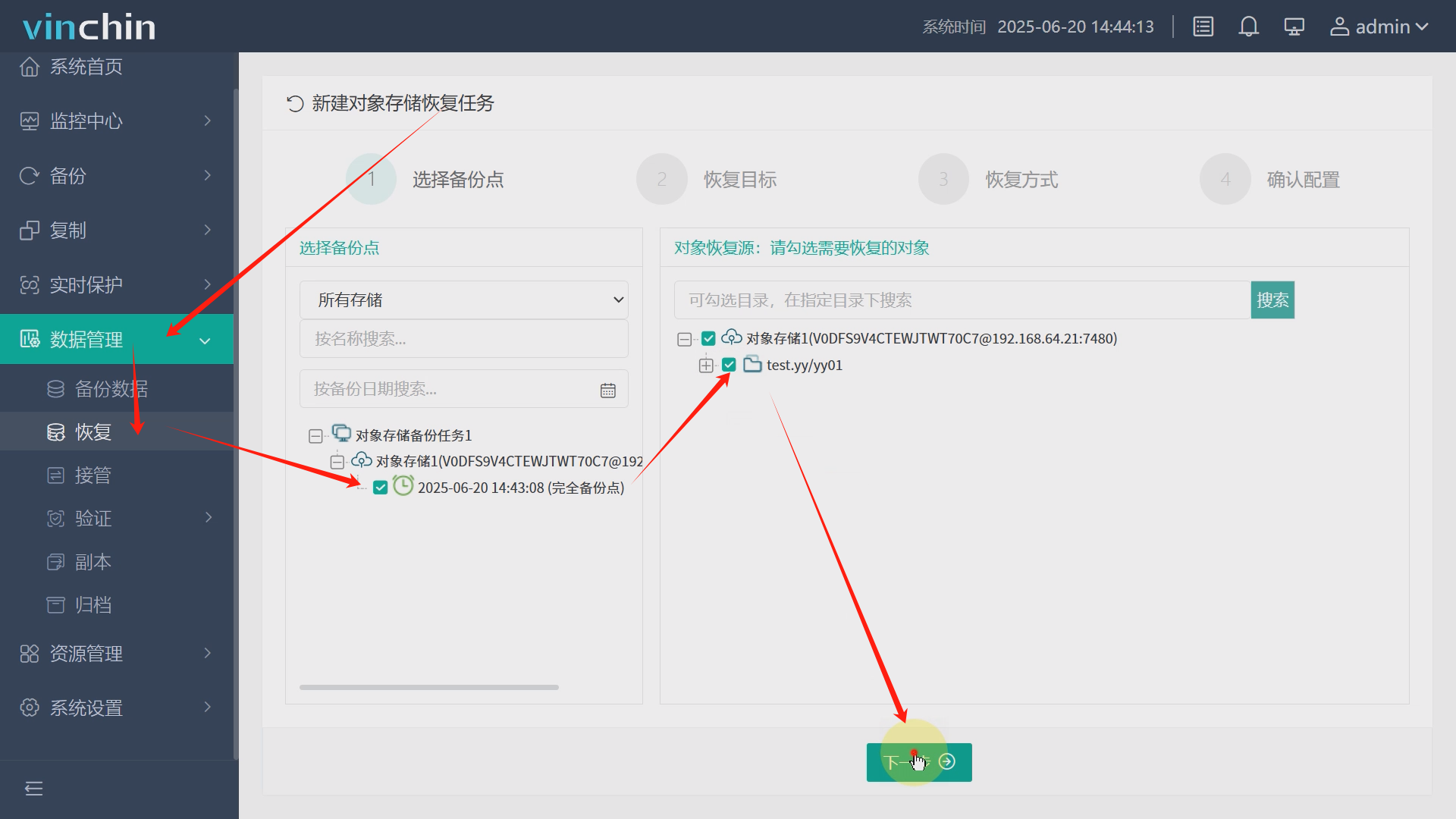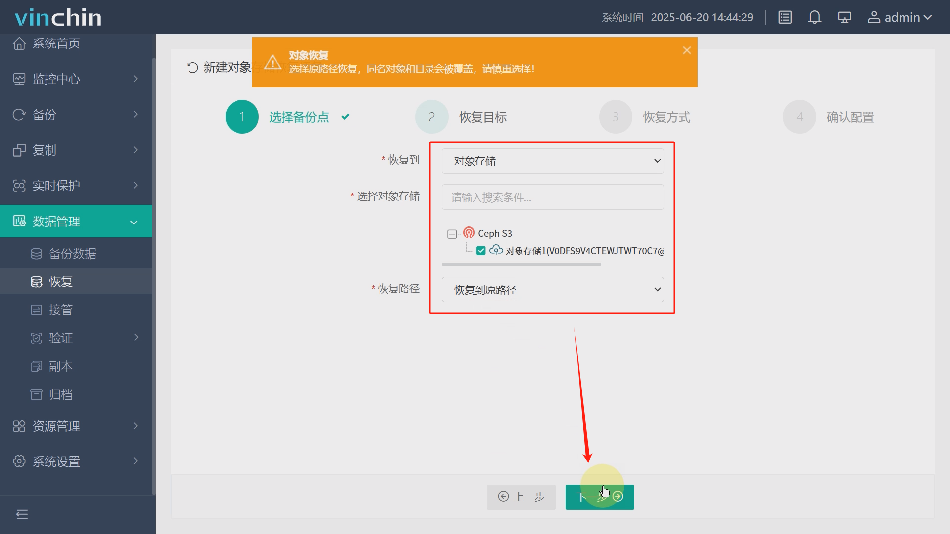 依次点击数据管理、恢复,选择对应备份任务产生的备份数据,可选择Ceph S3整个对象存储、桶、目录或文件,本次演示以勾选全部备份数据为例,如图10。