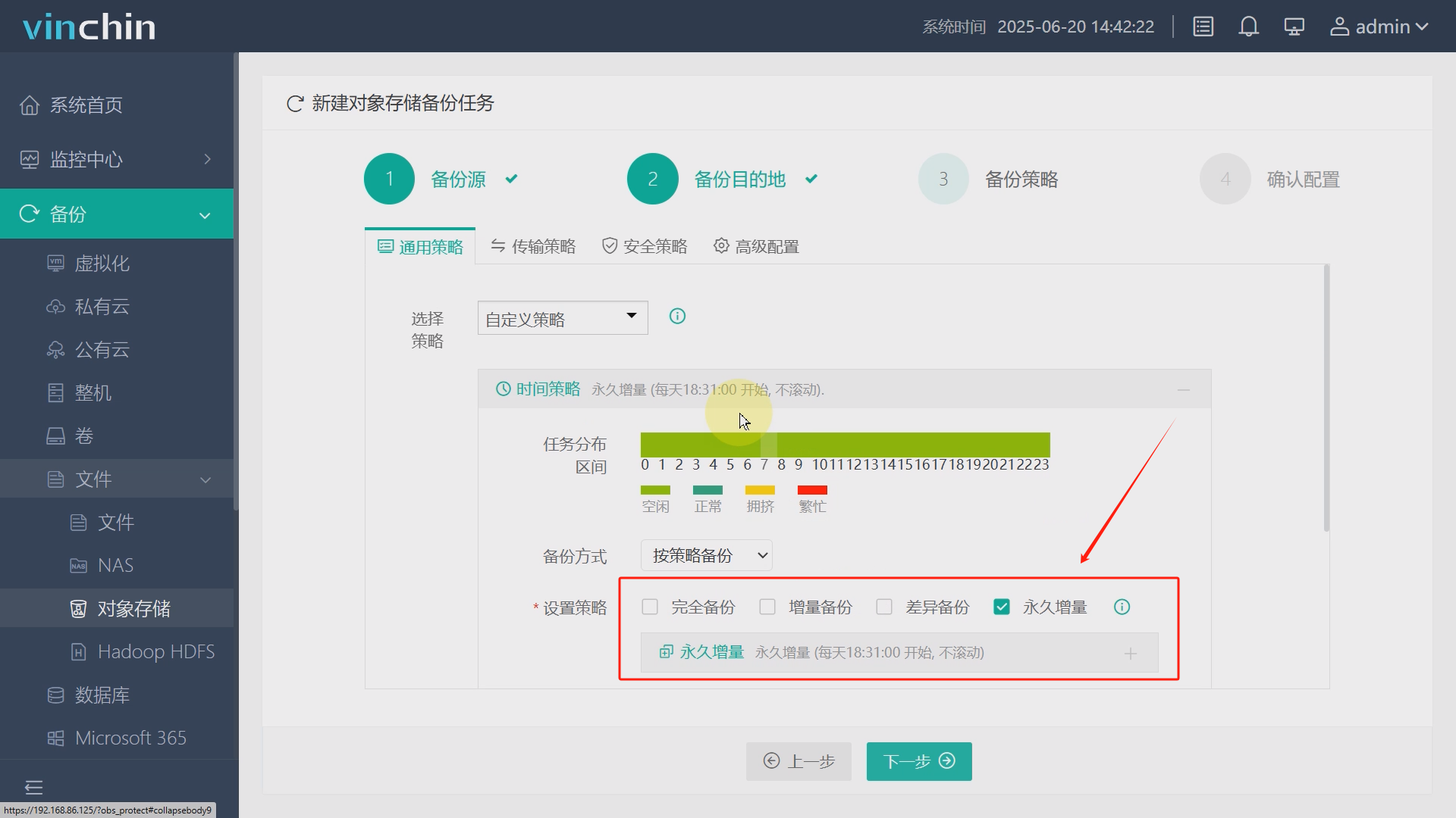 备份策略本次演示以每天一次永久增量备份为例,其余参与采用系统默认配置,如图7
