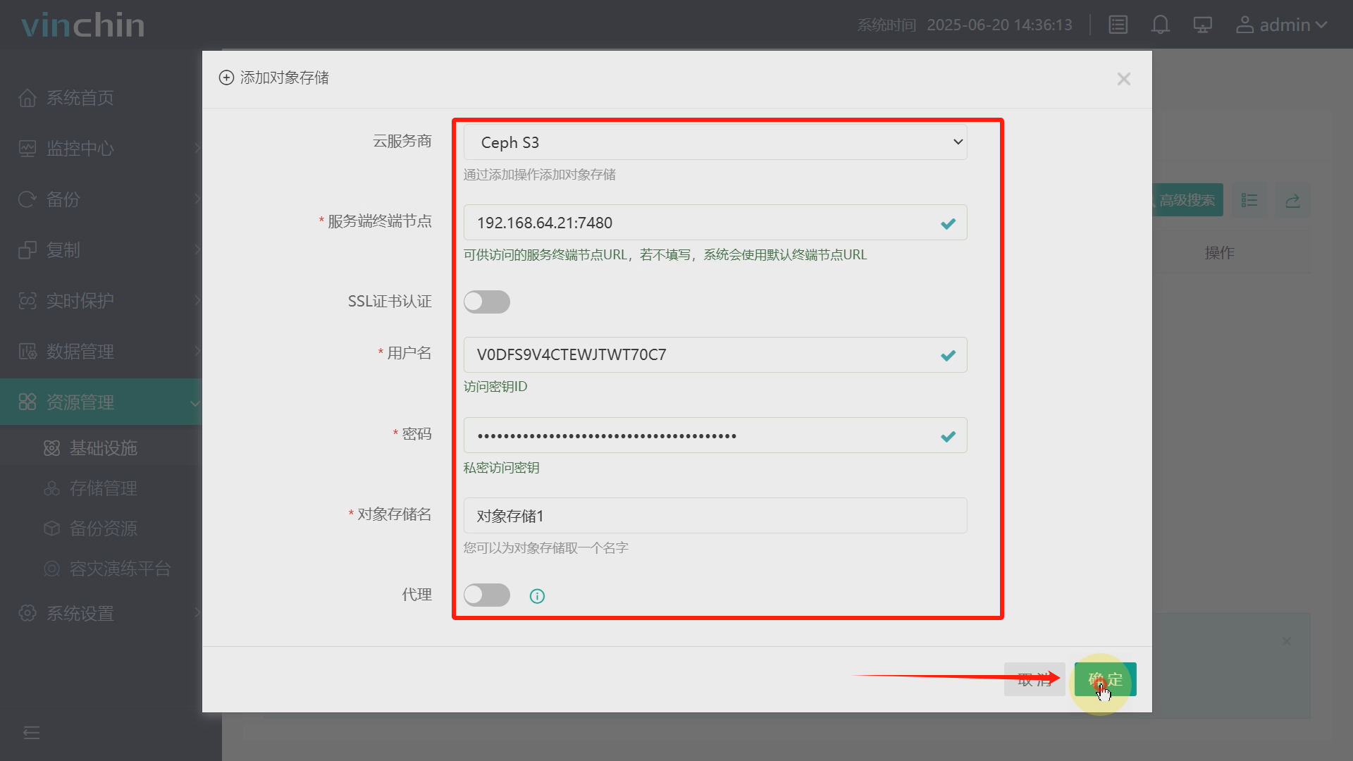 在弹出的页面中填写Ceph S3相关信息并点击确定,信息无误则添加完成,如图3、图4。