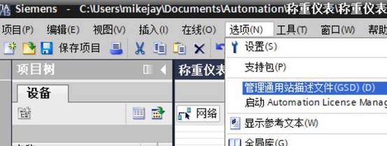第一步:称重仪表参见 MODBUS RTU通讯的说明书,首先加入 GSD 文件,将MODBUS转PROFINET 网关的GSD文件拷贝放到任意位置,打开博图(博途),建立新项目“称重仪表”,进入设备和网络,在选项中选择管理通用站描述文件,安装 GSD文件