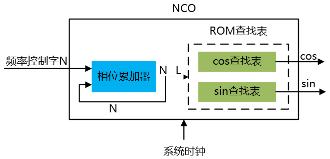 数控振荡器NCO(Numerical Controlled Oscillator)是一种从 相位 出发直接合成所需要波形的数字频率合成技术。可以通过设置不同的频率控制字实现输出不同频率的正余弦信号的功能。FPGA实现NCO功能可以分为相位累加器和查找表两部分,如下图所示: