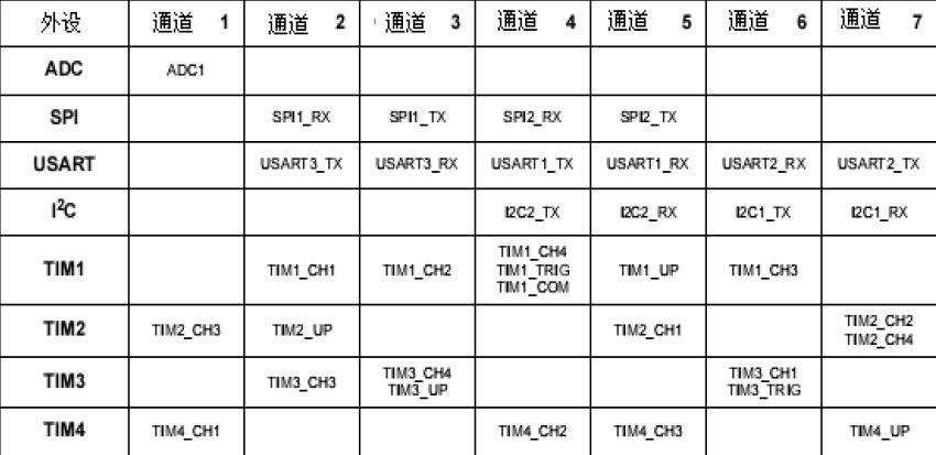 从STM32的手册中可以查看出DMA的各个通道请求总括: