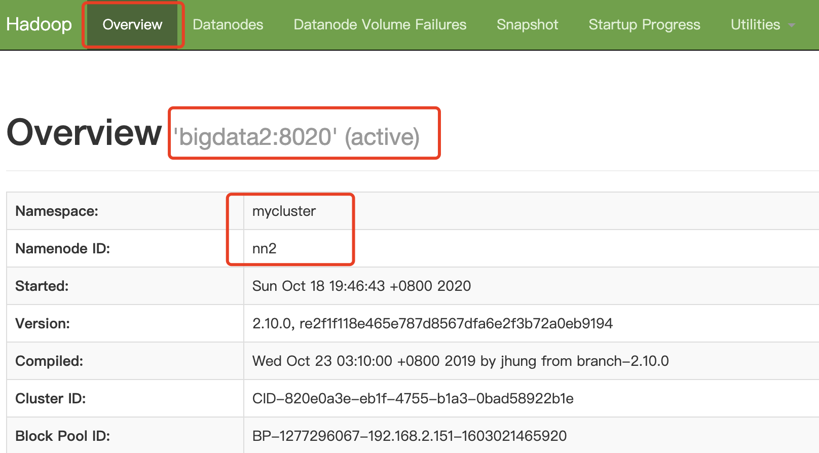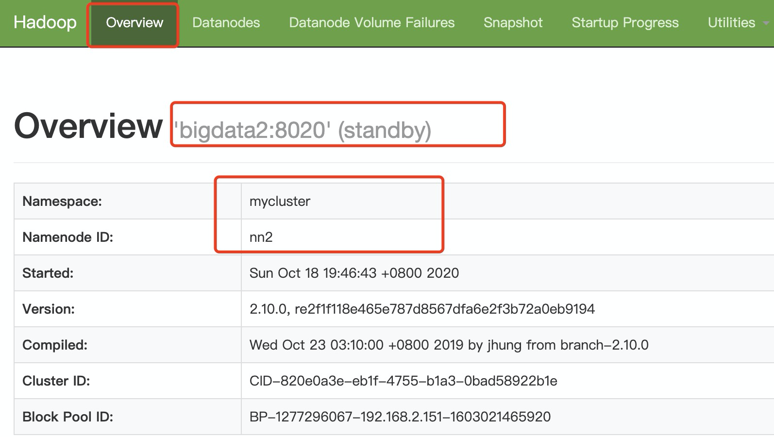 [root@bigdata2 hadoop-2.10.0]# bin/hdfs namenode -bootstrapStandby [root@bigdata2 hadoop-2.10.0]# sbin/hadoop-daemon.sh start namenode
