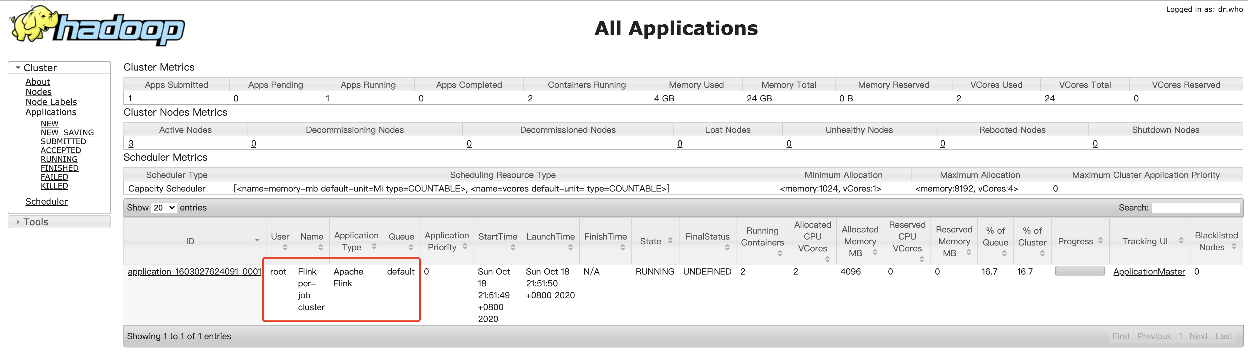 访问:http://bigdata1:8088/cluster 可查看到flink作业成功提交