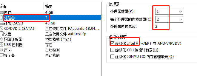 3)磁盘40G+,内存4G,磁盘40G ,物理机1个逻辑处理器2个,勾选虚拟化Intel VT-x,网络适配:桥接