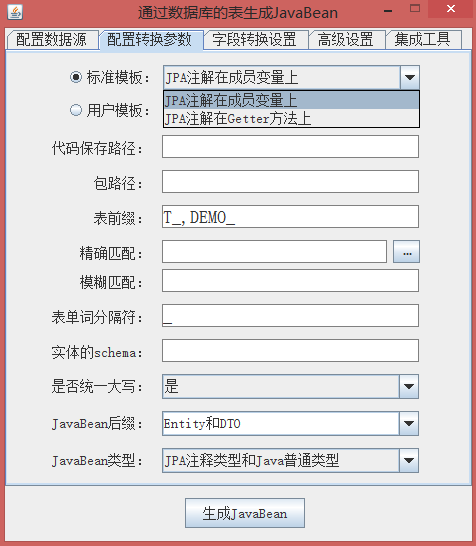 于是一怒之下,自己动手丰衣足食,就在去年自己用Swing写了一个通过数据库的表生成JavaBean的工具,支持MySQL、Oracle、SQLServce,完美支持JPA注解,可以同时生成Entity和DTO,可以自动去除表前缀,并支持去除多个前缀,支持精确指定只生成哪几个表的Bean,也支持模糊查找生成哪几个表的Bean,现在不但成员变量上能生成备注了,而且在Getter和Setter上也能有备注了!