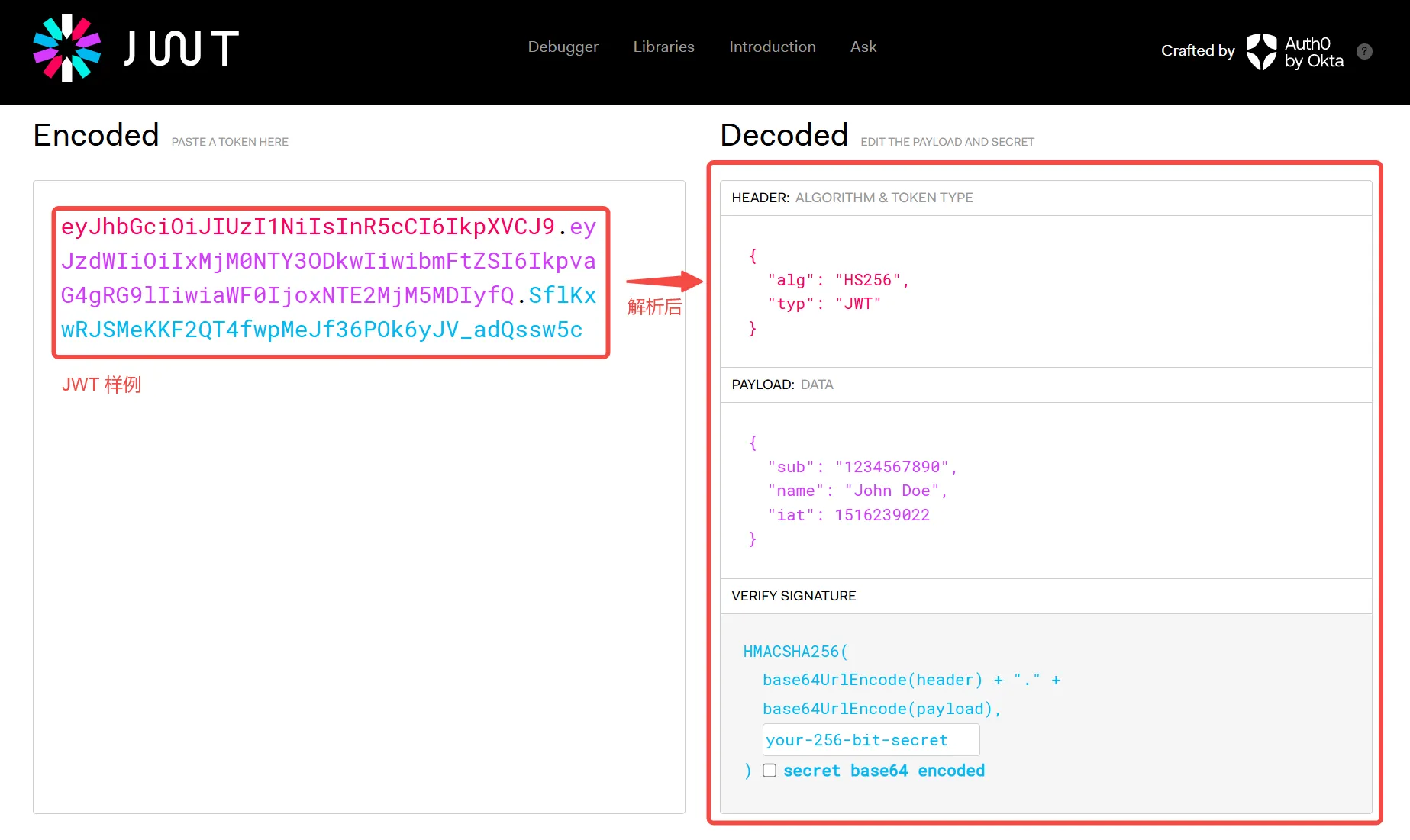 - 加密算法:例如 HS256(HMAC SHA-256)、RS256(RSA SHA-256)等。