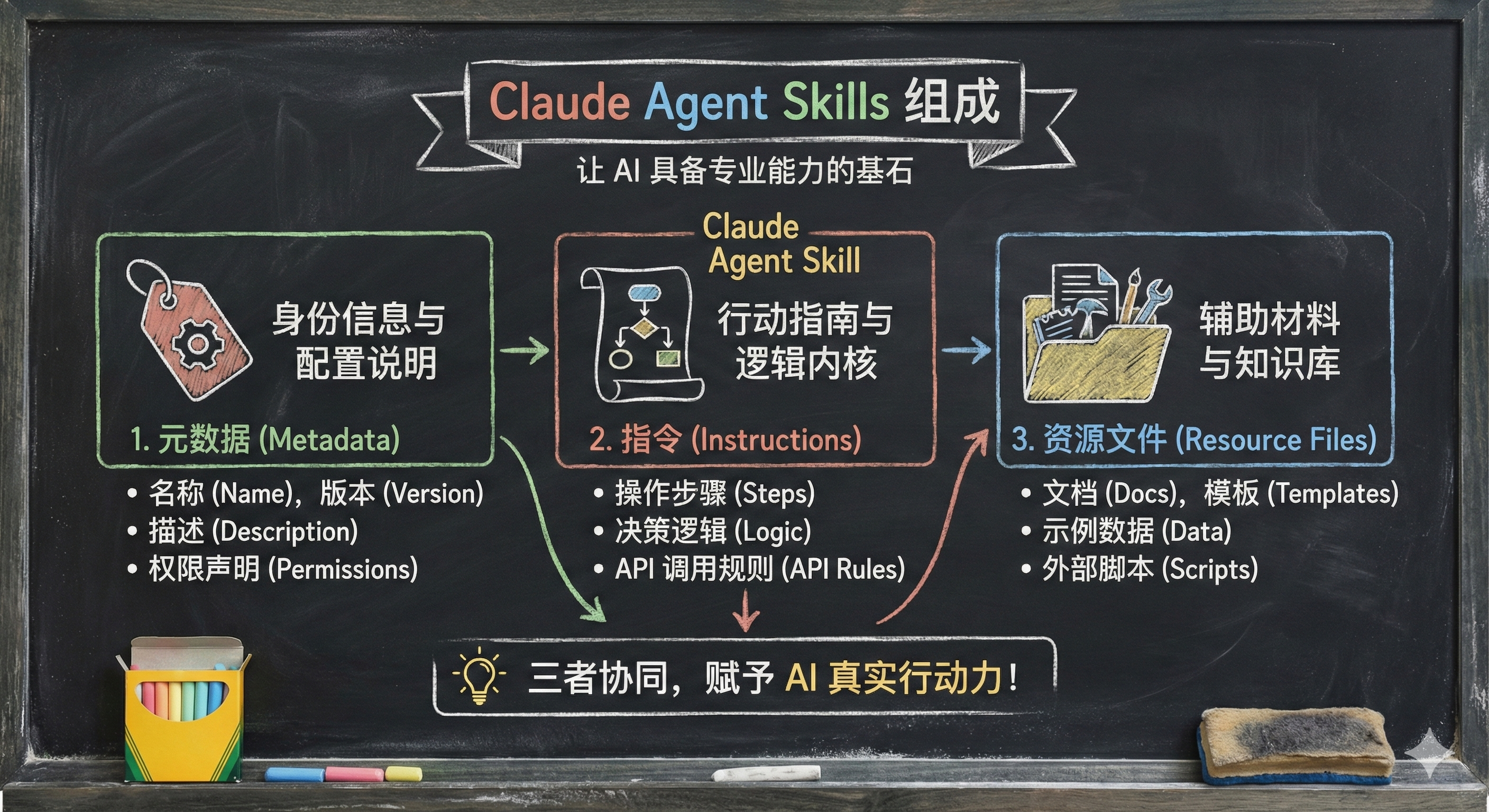 - 资源文件 (Resources): 这是最厉害的地方!它可能包含 Python 代码 或其他执行程序,保证程序在调用 Skill 时能完成复杂的动作。
