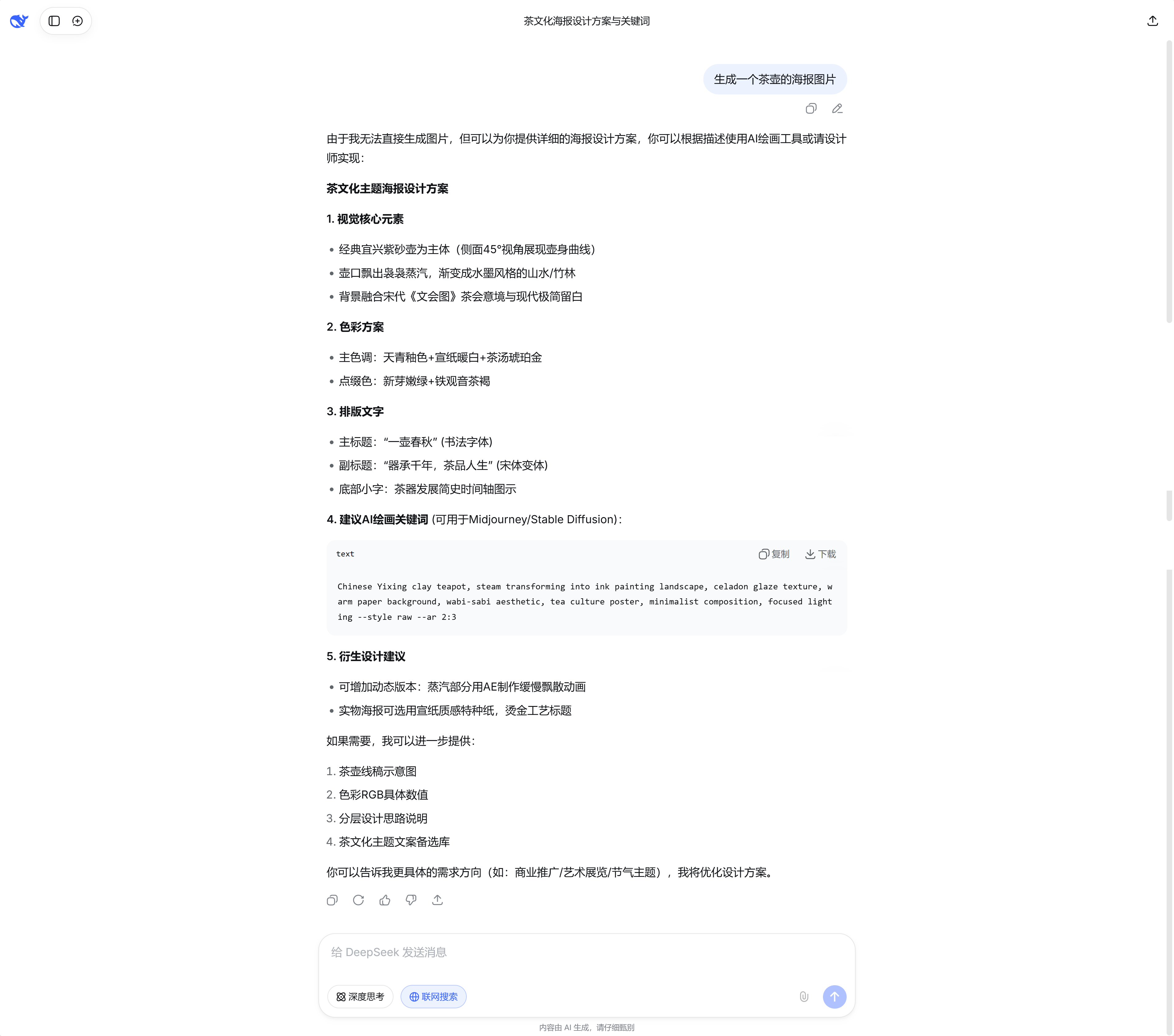 比如你问 DeepSeek 或者 Claude:“帮我画一张茶壶的海报。”