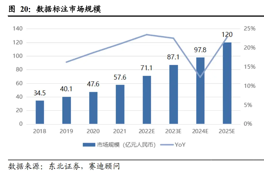 数据加工包含数据清洗、数据标注、数据审核等,本质上是提升数据资源质量的过 程,数据资源的质量越高其价值越大。具体分环节看:数据清洗:基本已经成为各企业标配的能力,基本在数据收集存储环节就已经完成;数据标注:由于非结构化 数据占比越来越大,对于数据标注行业的需求稳定提升,已经形成一个稳定成长的 行业,目前市场规模在 50 亿元人民币以上,每年保持 20%以上增长。