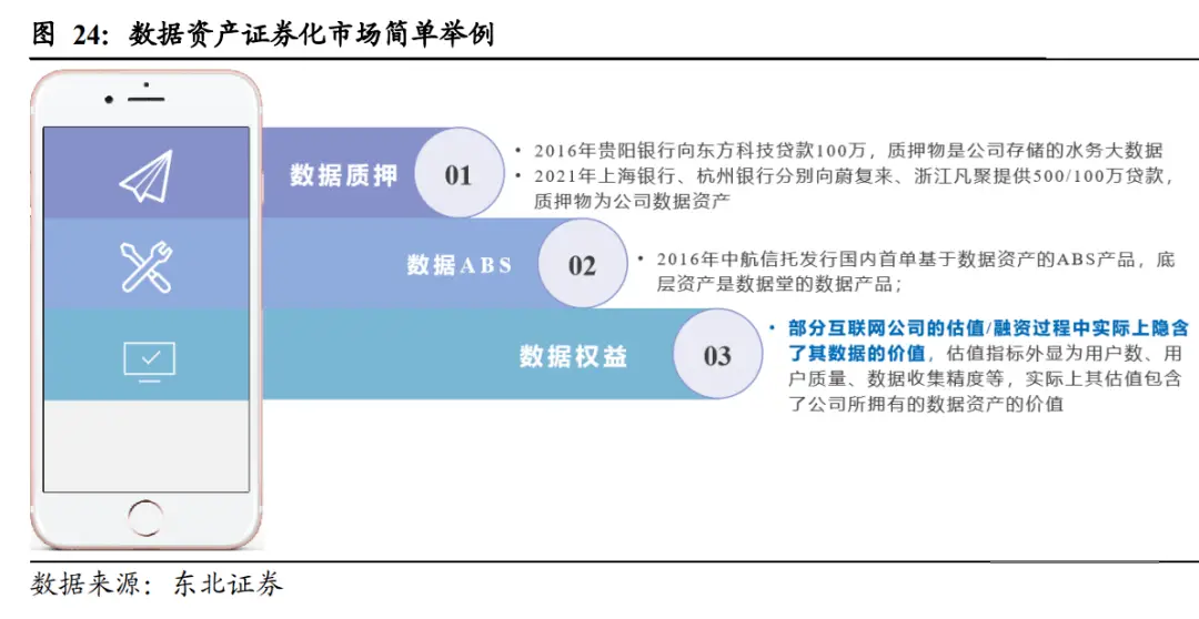 数据资本化是指数据被打包成金融产品进入资本市场,具体形式包括但不限于数据 质押、数据 ABS、数据权益,目前仍旧处于点状探索阶段,除了数据权益外没有特 别完善的理论和实践体系。目前数据入表(资产负债表)是学术界和产业界最关注 的政策指引方向,一旦数据入表政策公布,可能会引起整个资本市场的规则重估。