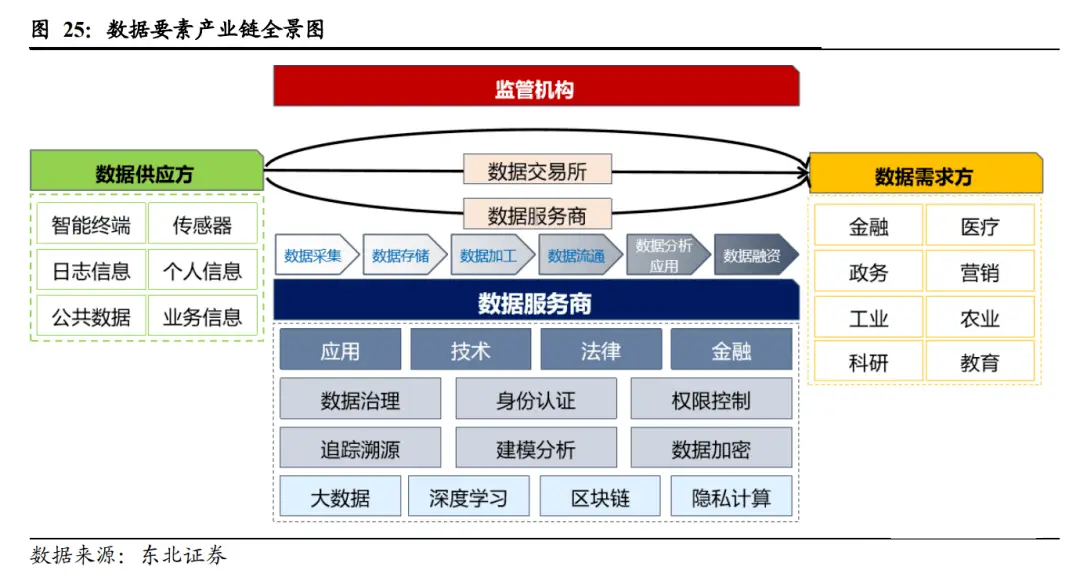 综上,结合产业链各参与者地位,我们可以得到数据要素市场产业链全景图。综合 看来,在政策的大力推动和各方面参与者的不懈努力下,我国数据要素市场体系已 经初步形成,但我国数据要素交易市场仍处于发展早期阶段,未来的空间、格局仍 在不断变化中。根据我们的推演,未来数据流通速度加快,受益最大的是数据供需 方、空间最大的是提供各类服务的数据服务商、而目前最火热的仍旧是数据交易所 行业。