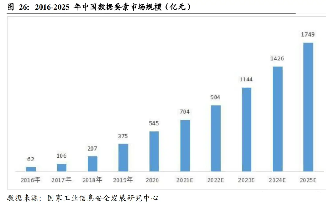 中国数据要素市场目前在千亿左右规模;但 这一数字非常保守,原因在于在市场空间计算时主要是数据采集、数据存储、数据 加工等现有可测量的环节,数据交易环节和规模最大的数据分析应用环节没有纳入;仅仅数据交易环节,国内每年黑灰产市场规模就在千亿以上。目前数据要素行业刚 刚处在正规化发展的初期,未来各行各业都会从中显著受益,当下去纠结市场空间 多大意义不大,更多应该以发展的视角看待这一成长行业。