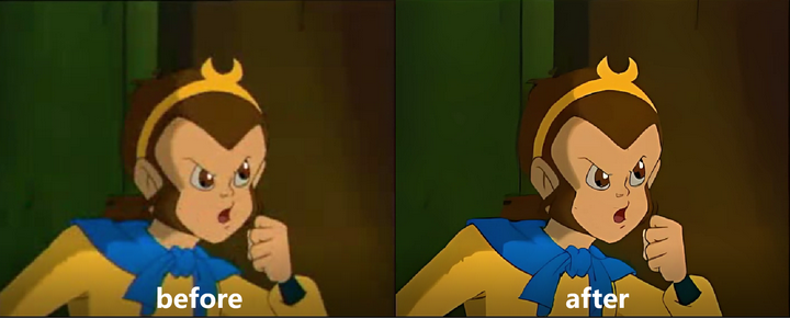 以动画版《西游记》为例,画面边缘轮廓模糊不清,存在马赛克、伪影等噪声,通过微帧画质修复增强,自适应判断噪声,并根据噪声强度进行智能调节,画面瞬间焕然一新,如获新生。
