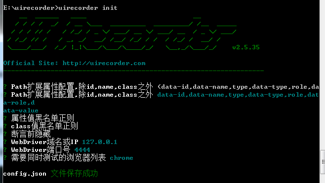 UI Recorder安装完成后第一步需要进行配置文件的初始化输入uirecorder init,根据我们的需求自己编写即可。这里小编除浏览器外,都选择默认。