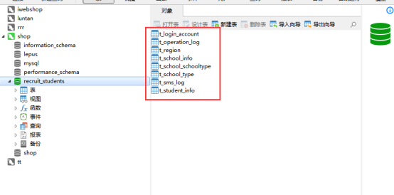 用mysql 客户端工具 navicat 连接mysql ->新建一个recruit_students 库。