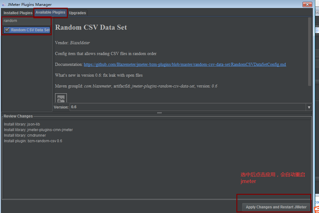- 找到插件Random CSV Data Set Config 选中进行应用,然后重启JMeter
