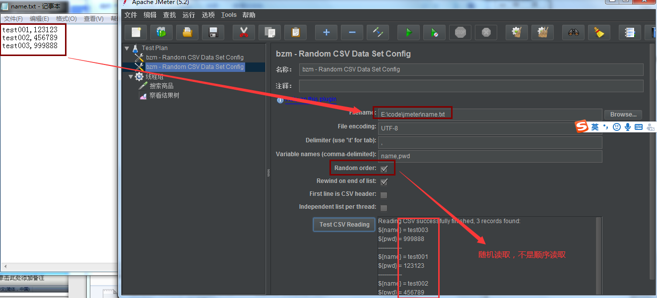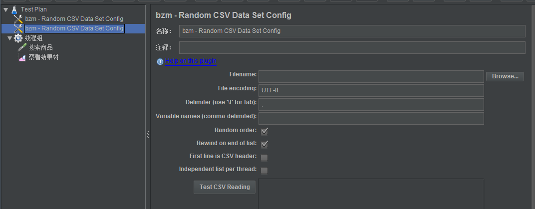 打开Random CSV Data Set Config元件:线程组>配置元件