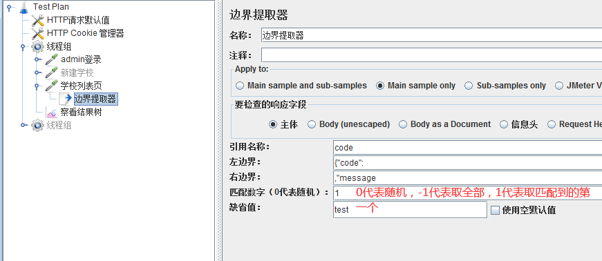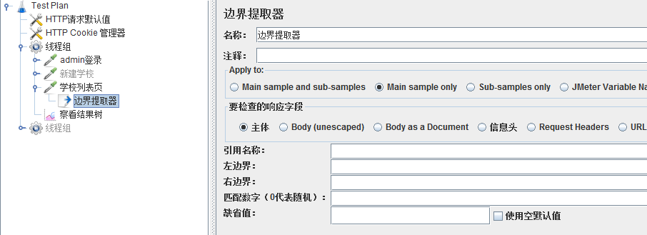 在填写边界值提取器之前,可以在查看结果树中先测试一下: