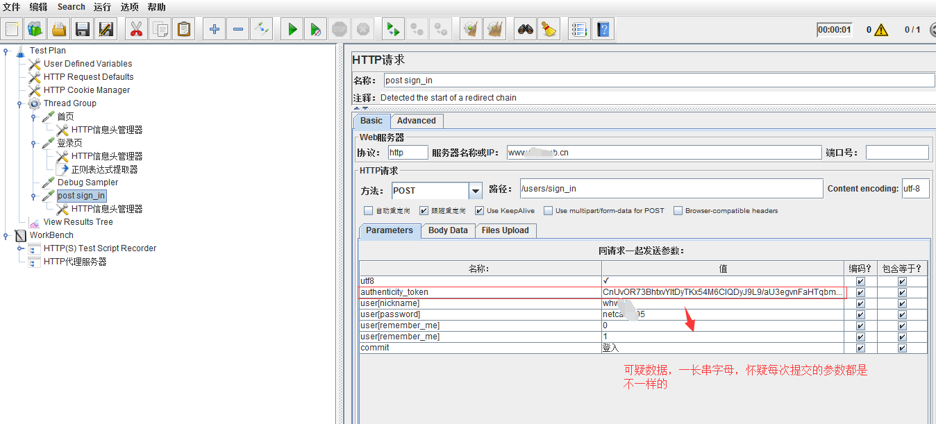 2. 然后通过抓包看每次登录提交的authenticity_token值都不一样,所以就是这个值需要关联了