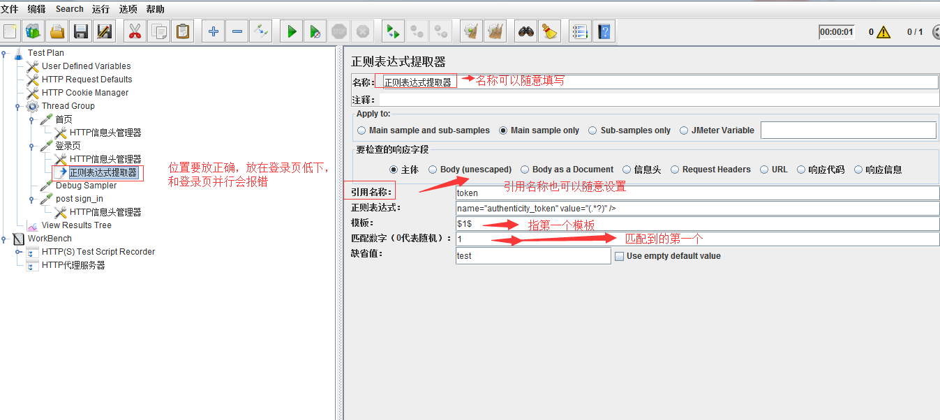 - 引用名称:正则取出来的数据放在变量中,变量的名称自己根据实际情况写,比如:token、id等。把值放在变量中,供后续的请求使用。