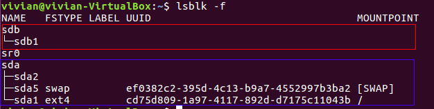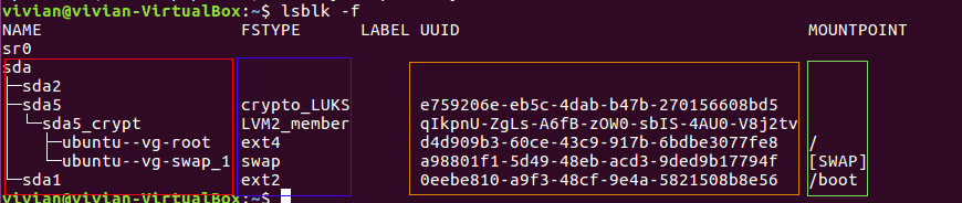 红框表示的是磁盘分区情况,蓝框表示的是分区的类型,橙框是32位不重复的字符串表示UUID即分区唯一标识符,绿框表示分区在文件系统的挂载点。