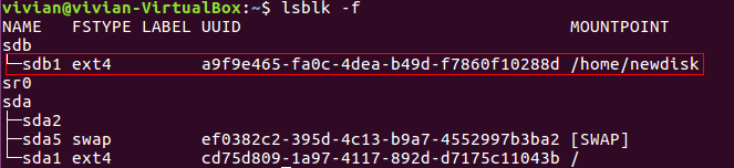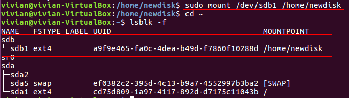 再将sdb1挂载到newdisk下,mount /dev/sdb1 /home/newdisk