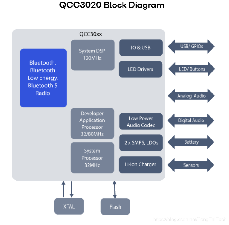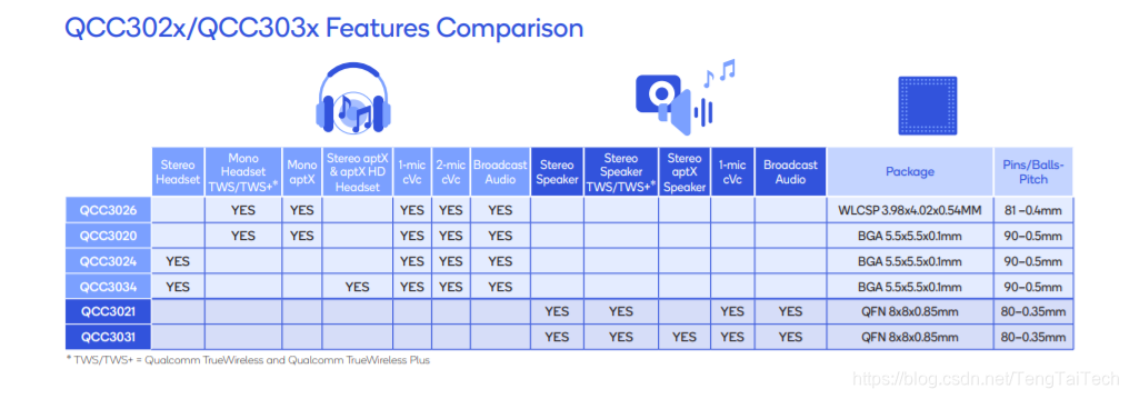 QCCC3020 is an entry-level flash programmable Bluetooth Audio SoC based on an extremely low power architecture which has been designed for use in compact feature optimized Qualcomm TrueWireless™ Stereo earbuds.