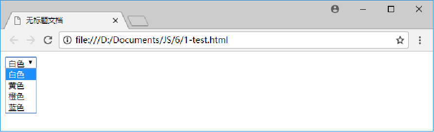 - 在 <select> 标签下加入多个 <option> 标签,<option> 标签的值设置为不同的颜色值,如 blue。在<option> 标签下加入文本节点,分别显示不同的颜色,如蓝色