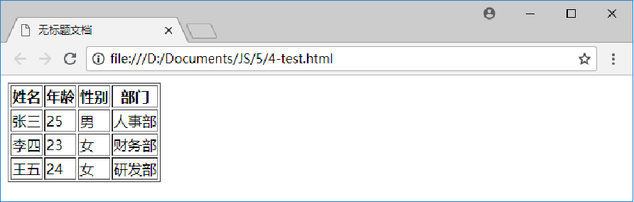 在页面上绘制一张表格,动态地向表格中添加公司员工的基本信息,测试数据不少于3 条,员工信息包括姓名、年龄、性别和部门