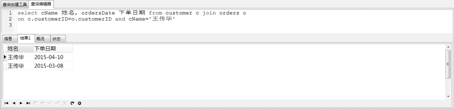 使用等值连接获取客户“王传华”所有的下单日期信息:
