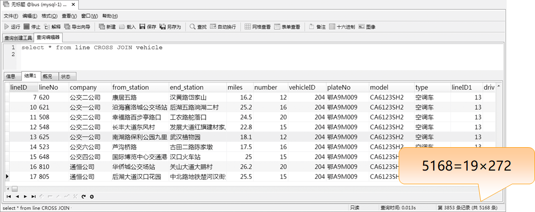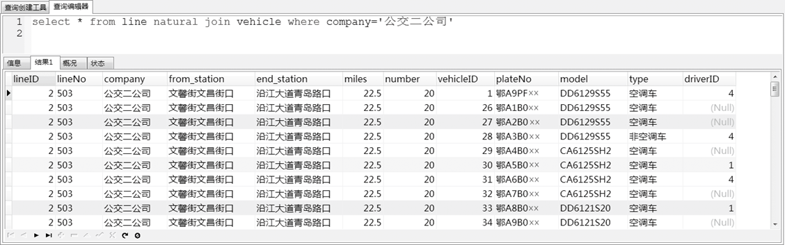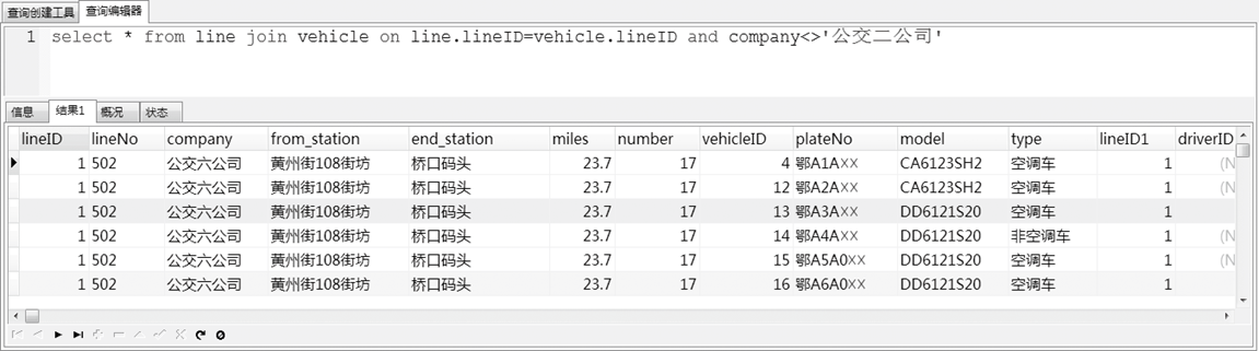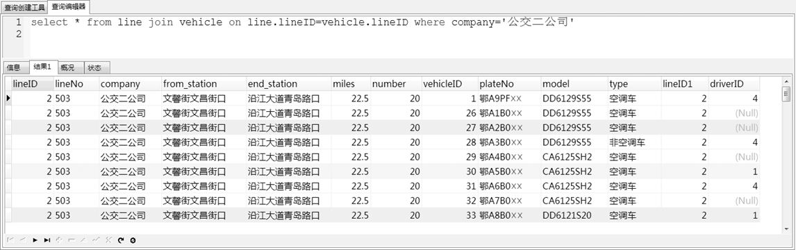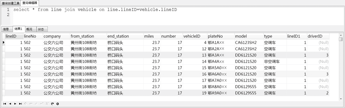 示例:使用内连接获取公交二公司的线路信息和车辆信息。