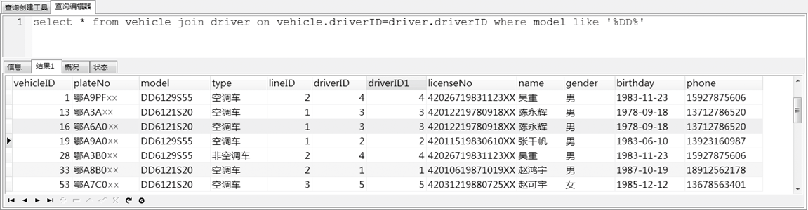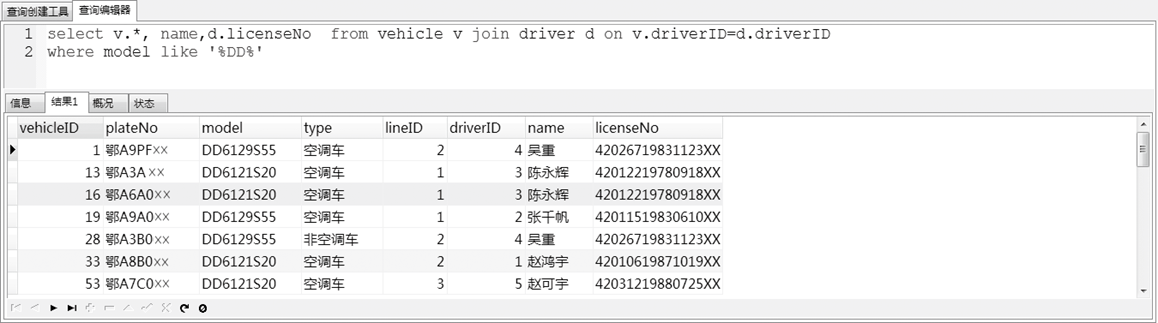 示例:使用内连接获取车辆型号含有“DD”字样的车辆信息和司机信息,要求车辆信息为全部列,司机信息中只需包含姓名和身份证。