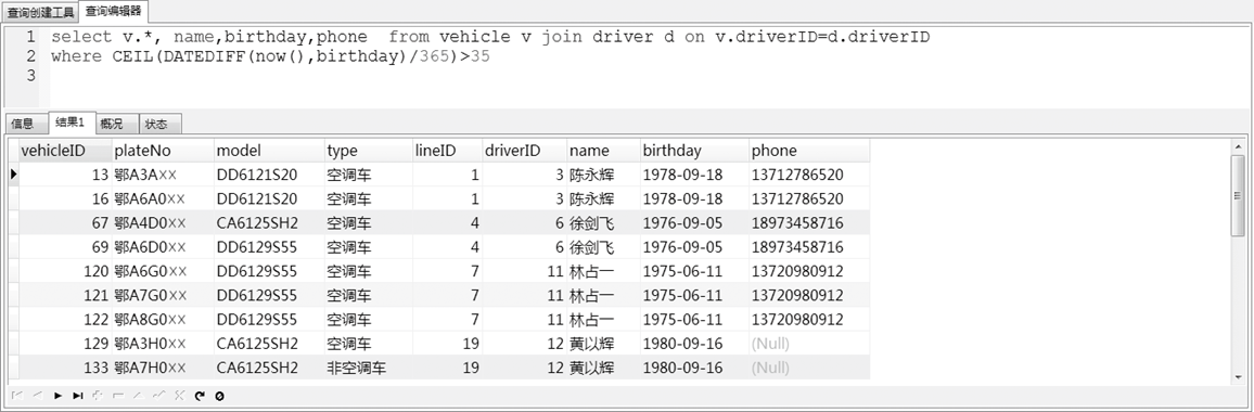 示例:使用内连接获取年龄大于 35 岁的司机信息和该司机所驾驶的车辆信息,要求车辆信息为全部列,司机信息中只需包含姓名、出生年月和电话。