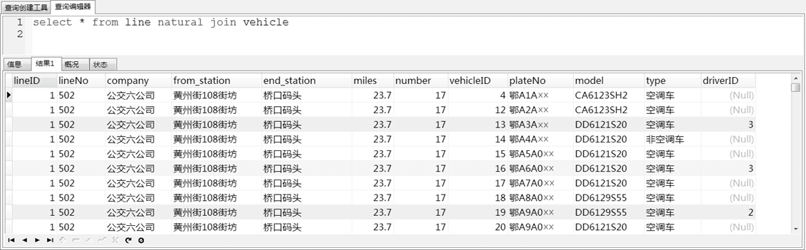 示例:用自然连接获取公交二公司的线路信息和车辆信息。