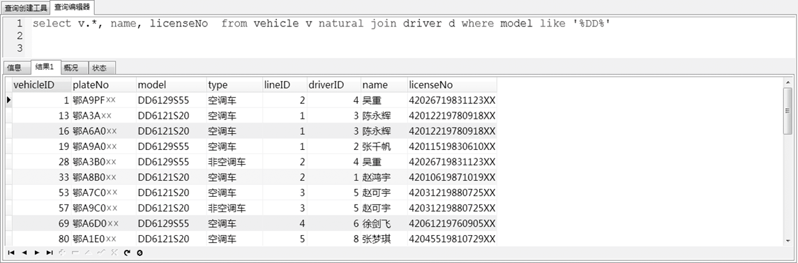 示例:使用自然连接获取车辆型号含有“DD”字样的车辆信息和司机信息,要求车辆信息为全部列,司机信息中只需包含姓名和身份证。