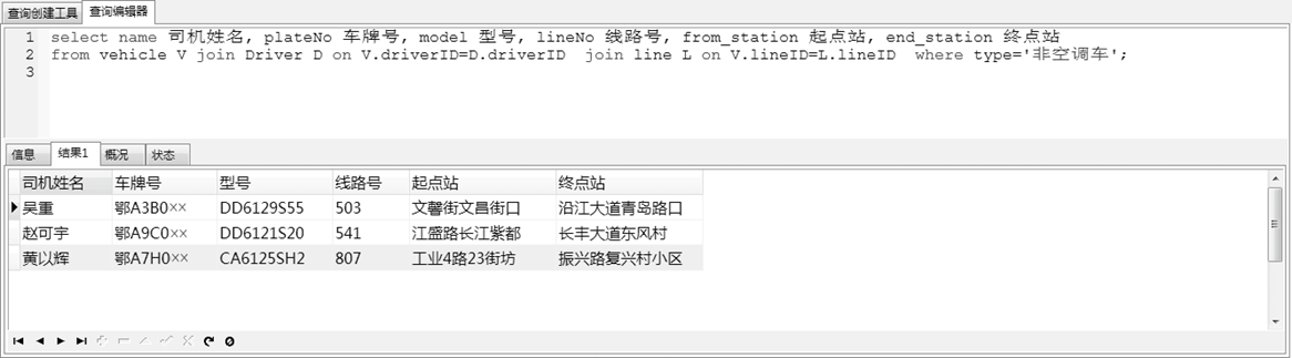 示例:获取所有非空调车的车牌号、型号和司机姓名、所属线路的线路号、起点站和终点站信息。