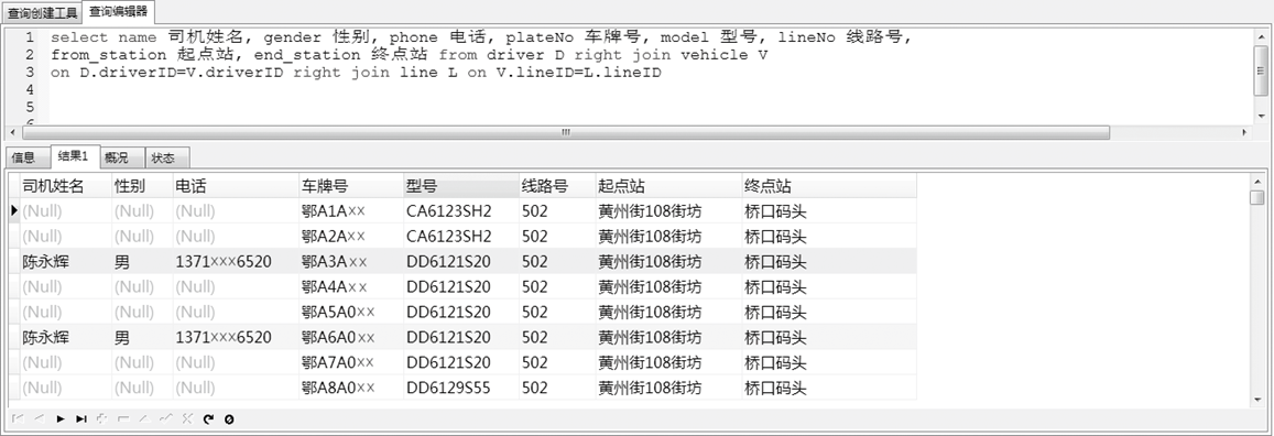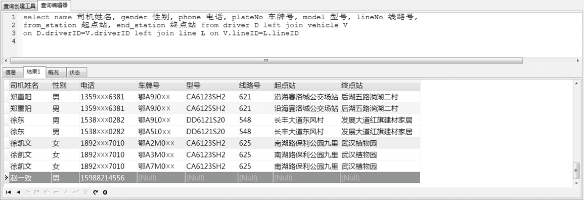 分析:连接表为司机表、车辆表和线路表。由于需要显示所有的司机信息,所以需要将司机表和车辆表作为左表(3 张表的连接次序为司机表、车辆表和线路表)。